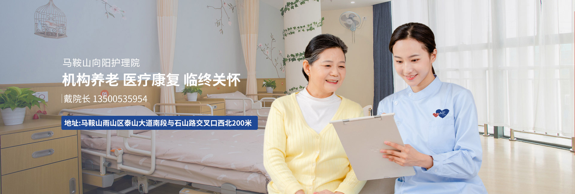 马鞍山向阳护理院成立于2008年,为具有法人资质的民办非企业单位,既是相关部门批准设立的养老机构,也是相关主管部门批准设置的医护机构。该院坐落在马鞍山市雨山区向山镇境内的岱山东麓(泰山大道南段与石山路交叉处),这里山青水秀、姹紫嫣红、林木葱茏、环境幽雅,是一片满目苍翠的生态园区、一块温馨静谧的康养福地。 向阳护理院建成投入使用总建筑面积1.6万余平方米;设计总床位数360张,现实际开放老年养护床位260张,常年在院接受养护和照护服务的失能、半失能、失智老年人;残疾人;五保老人;民政救助人员;临床老年长者和临终关怀老人。 向阳护理院为医养结合机构,开设了西医诊室、中医诊室、预防保健室、康复理疗室、临终关怀室等,拥有由临床医师、护士、康复师、营养师、心理咨询师、健康管理师、养老护理员和管理人员等组成的专职服务团队共60余人,其中副主任职称以上人员5人、中级医护人员10名;团队中医护人员与其他人员比例达1:1.5,技...